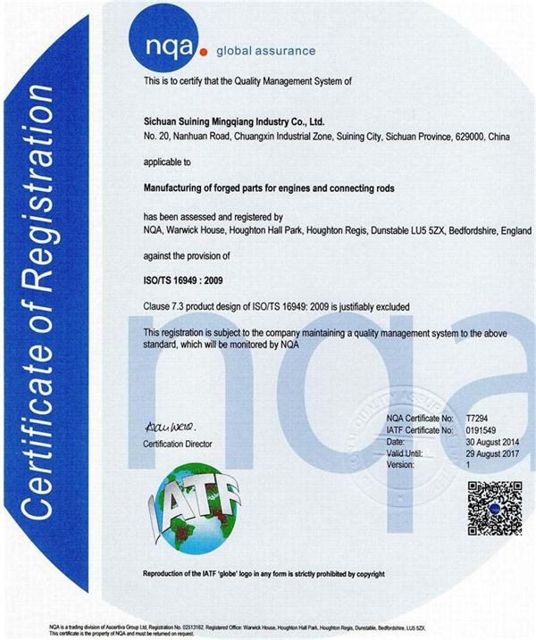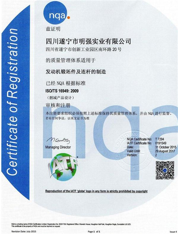四川遂寧市明強(qiáng)實業(yè)有限公司 發(fā)動機(jī)鍛呸及連桿的制造證書 (中文版 英文版 )